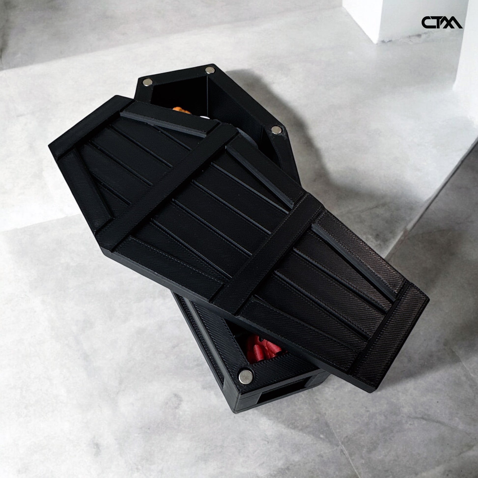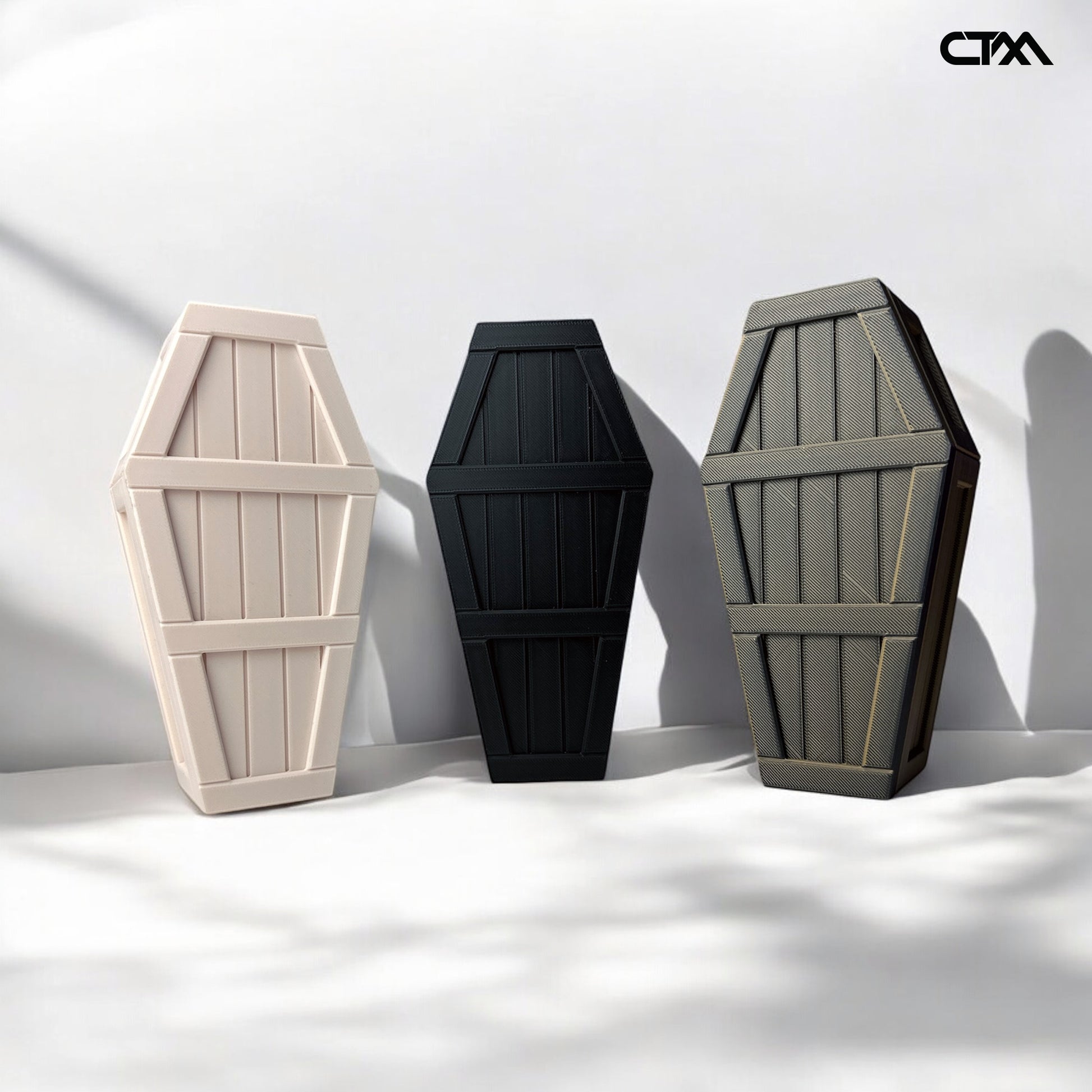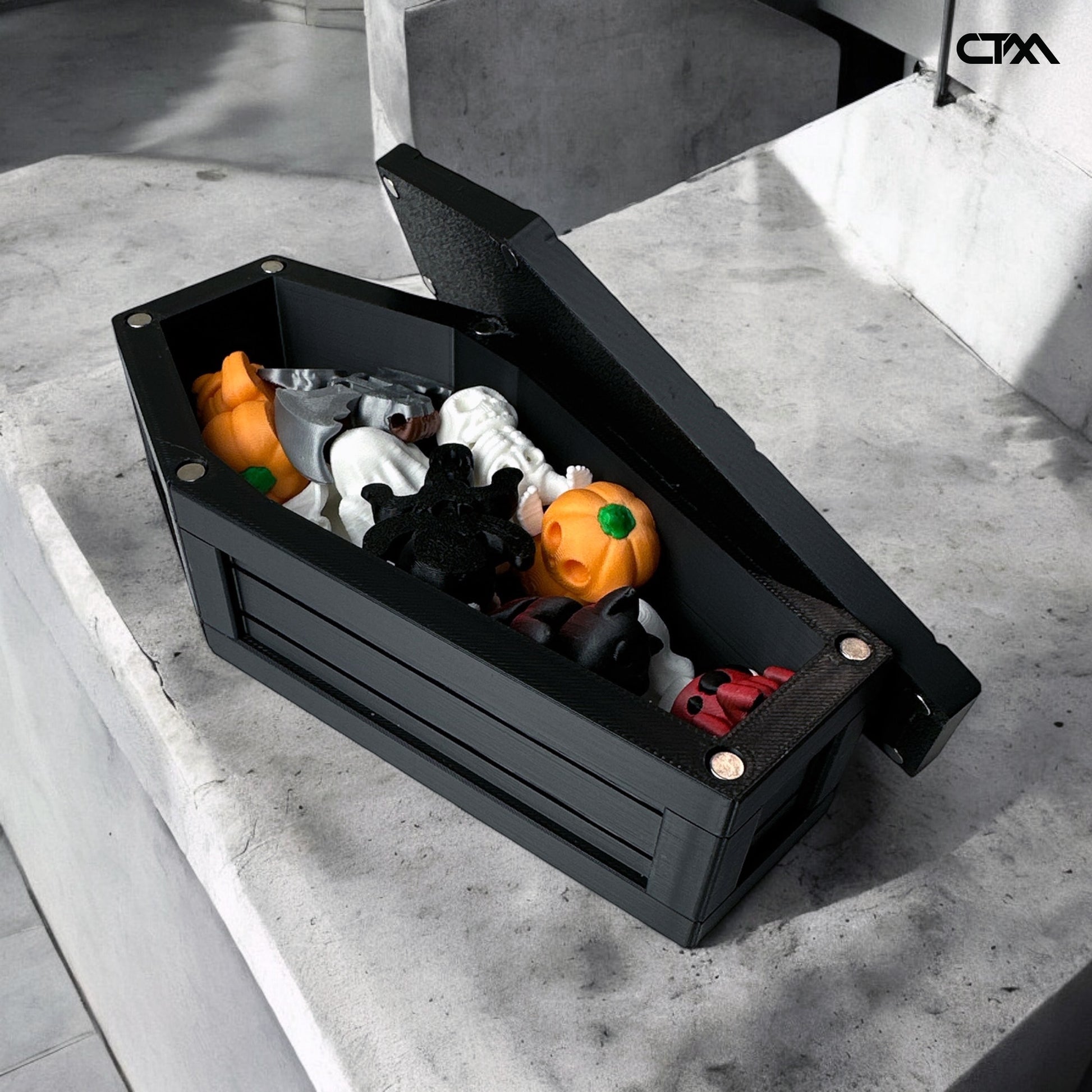 The Coffin Container combines sleek design with practical functionality. It features a magnetic lid for secure and easy closure, and with a height of 6.5 inches, it's perfect for both storage and decoration. You can purchase these chests individually or opt for our Halloween Mystery Pack, which includes 10 mini Halloween figurines hidden inside!